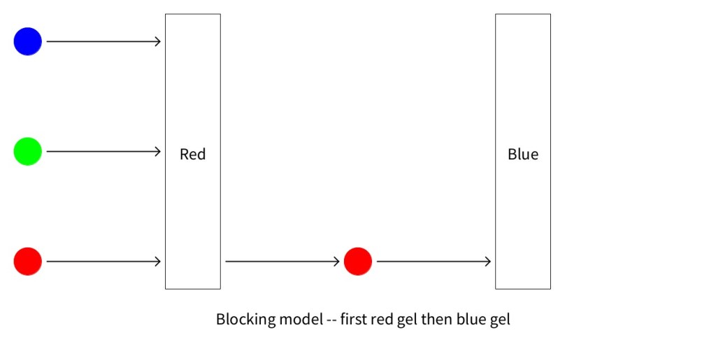 The two figures below show the predictions made by the block model for a sandwich of a red and blue model. Notice that this model predicts that sandwich of red and blue lets no light through and it doesn’t make any difference whether light passes through the red gel first or the blue gel first.