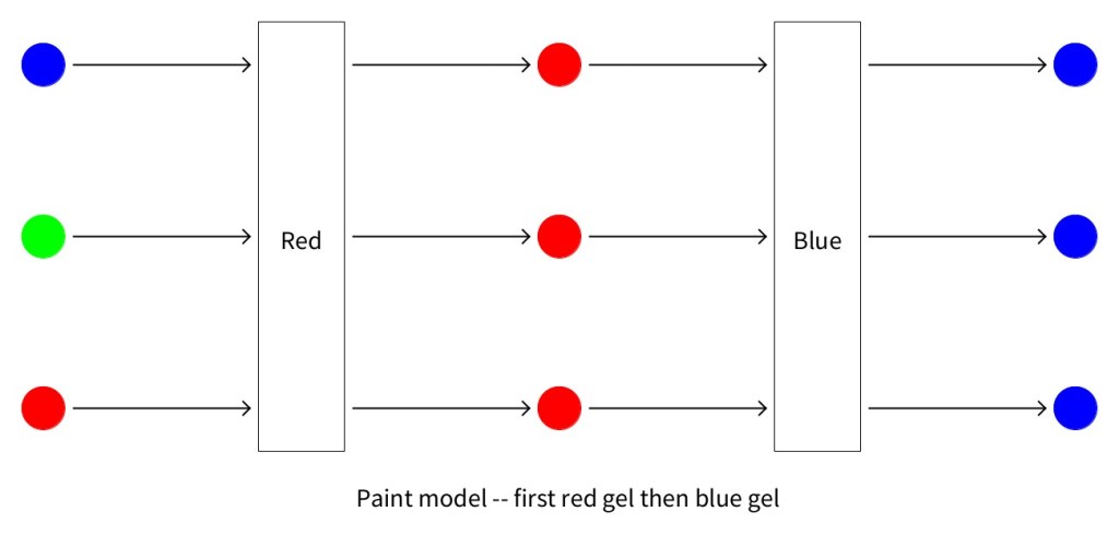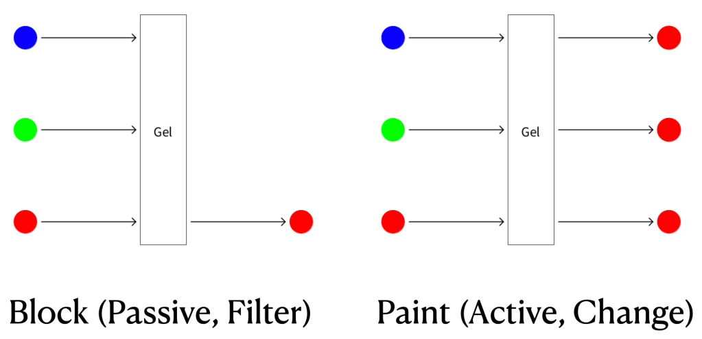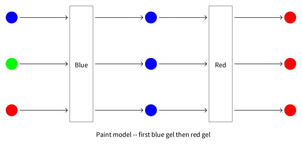 Two Models: Your students (and you) should come up with two plausible models. The first model, shown on the left below, is a “passive,” “filter” or “block” model, which says that each gel lets some colors through unchanged but blocks others. Thus, a red gel lets red through but blocks green and blue. The second model, shown on the right below, is an “active,” “change” or “paint” model, which says that the gel lets some colors through unchanged but transforms or “paints” others. Thus, a red gel lets red through unchanged but paints green and blue light red.