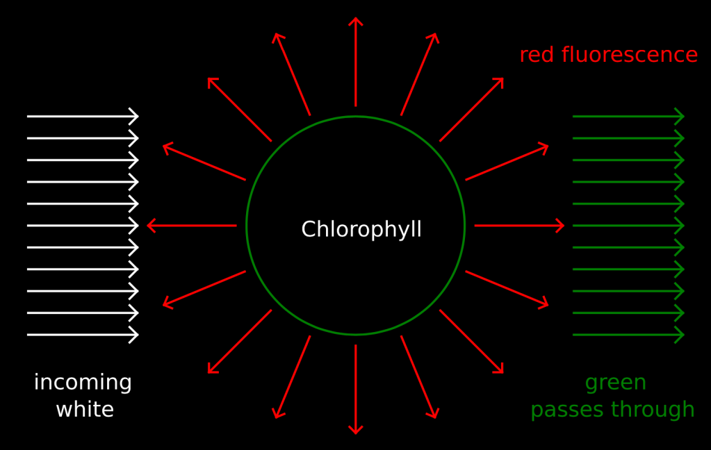 When white light interacts with a chlorophyll molecule green passes through but some of the other colors do not. The energy from light that is not passed through is used in various ways. Some of this energy interacts with atoms in the chlorophyll molecule and kicks electrons in those atoms up to higher and unstable levels. When these electrons fall back down they emit red light in all directions. This is called “fluorescence.” Click here for more information on how to do this experiment and more about the mechanisms behind the interactions between light and chlorophyll. Our observations in this experiment lead us to a deeper understanding of chemistry.