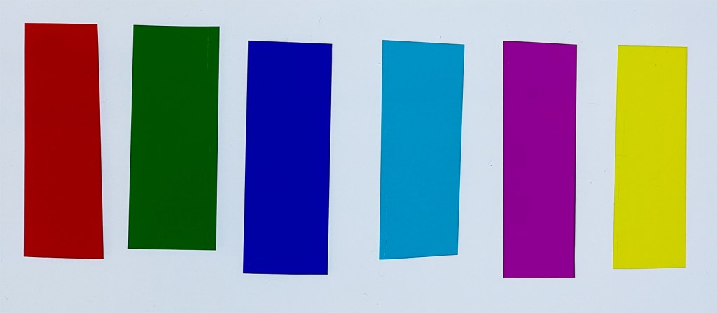 Props: Six different gels. Light passing through three of them — the red, green and blue ones — contains only red light, green light and blue light, respectively. As part of this scene you may determine the RGB make up of light passing through the other three — cyan, magenta and yellow.