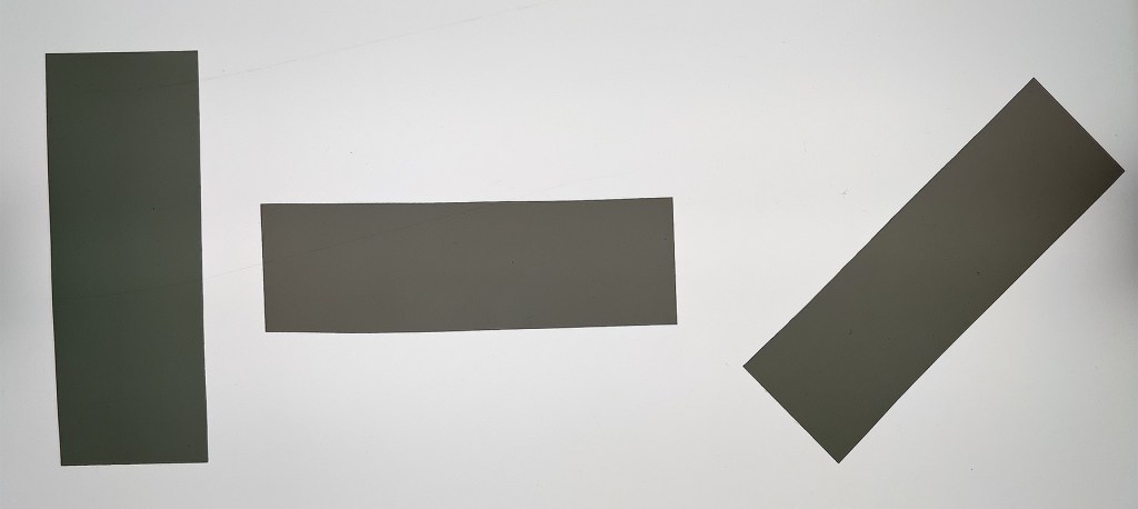 In the picture above these three strips are lying on top of a white light source. You may want to hold them up to a light source – perhaps a sheet of white paper taped to a window. These observations involve polarized light and some of the handiest light sources produce polarized light that will destroy these first observations. If your television or computer monitor uses an LED screen then it produces polarized light and is not usable for these first observations.