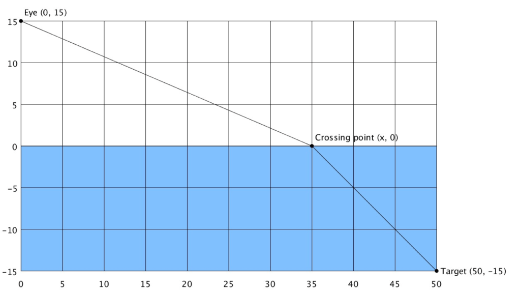 Our first model, for color, was based on a simple, even overly simple, model of color – the RGB model. Now we use a simple model for how light travels. This is a simple version “light follows the fastest path” from one point (a target) to another (an eye)” of Fermat’s principle. The figure below is used to understand phenomena refraction in a washbasin using this principle.
