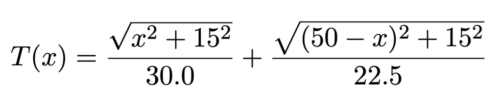 Light travels at a speed of 30 cm/ns in air and 22.5 cm/ns in water. The mathematical skill anthropomorphic photons need is finding the minimum of a function. You and your students may use Calculus or technology like graphing calculators or Desmos. The figure below shows a typical problem,