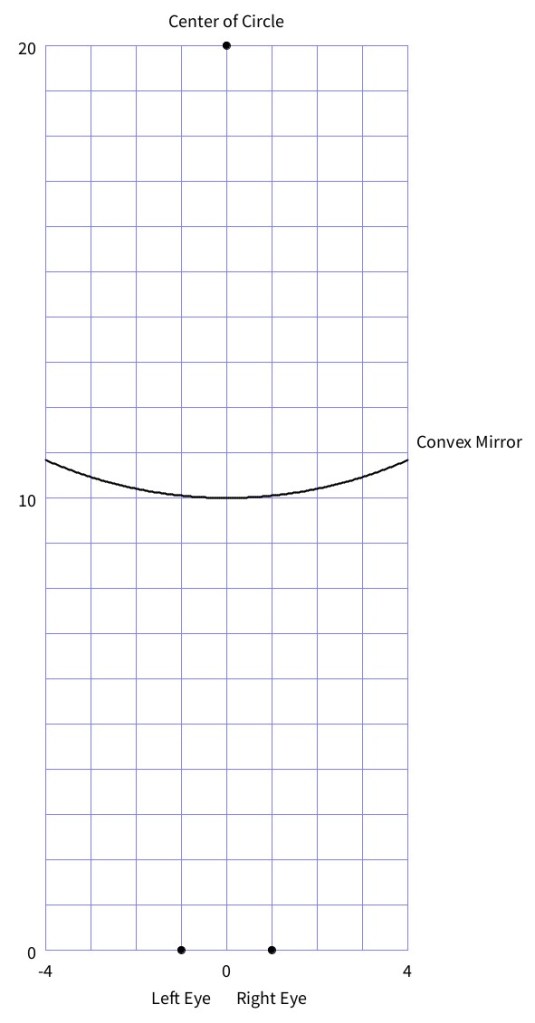 One interesting observation is that the reflection appears to be quite close, much closer than it would be if the mirror were flat. Note the red dots that represent where the reflection of the two eyes would be if the mirror were flat. Your brain judges distance using various clues. One clue is size and this clue tells us that the reflection is further than it would be if the mirror was flat. This clue is the reason why “objects in the mirror may be closer than they appear.”