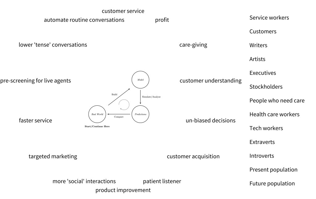 Today we will live the life of a scientist/mathematician in a “participatory, improvisational play” with many short short scenes, each following one cycle through the modeling cycle or scientific method shown in Figure 1. You will play the roles of your students. Each scene has the same structure, a structure that lends itself to the classroom: we begin with observations in the real world, then we develop a model or a theory to help us understand what we’ve observed, then we analyze that model to see its implications and predictions; finally we compare these predictions with the real world setting us up for future trips around the modeling cycle, producing better and more useful models. We will use cheap “equipment” – things found around the house or readily available (some swag) for experimentation and observation. By the end of our workshop we will be using this approach to inform high stakes, often controversial, decision-making as shown in Figure 2 – for example, decisions about how to use the capabilities of technologies like ChatGPT and future even more powerful capabilities driven by quantum computing.