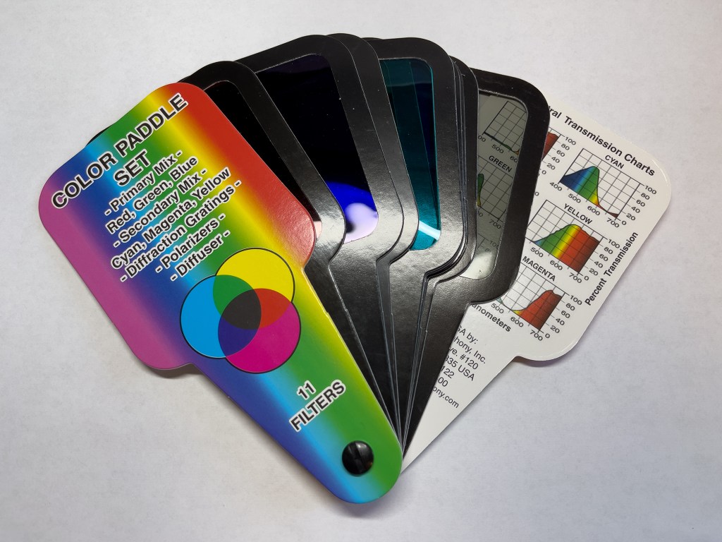 We (and your students?) will be doing many experiments with light. Your swag includes some of the items discussed below but we really like the Color Paddle Set that is sold by rainbowsymphony.com and is also available from Amazon.com. It includes six colored gels, two linear polarizing filters and two diffraction gratings all mounted in sturdy cardboard. We’ve bought these for under $12.00 but the price now seems to be $20.00. We particularly like the spectral transmission charts that make the connection between the RGB model we use here with the gels and the light spectrum.